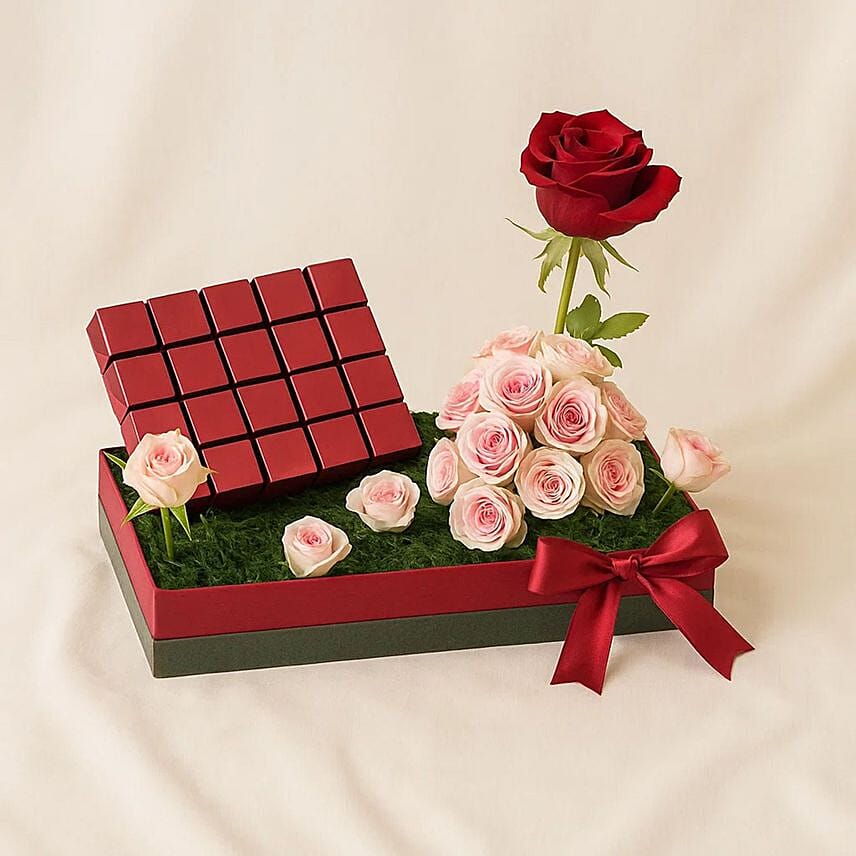 Elevate your gifting experience with our stunning flower and chocolate gift arrangement. This gift combo features a stunning bouquet of roses, delicious chocolates in elegant red packaging, and charming decorative elements. Perfect for expressing love and gratitude on Mother s Day, an anniversary, a birthday, or any other happy occasion.