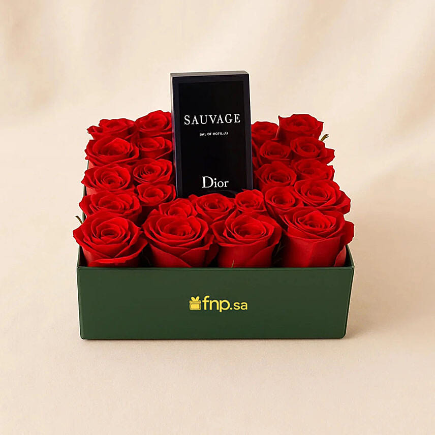 A luxurious expression of love in Dior Savage perfume for men with a natural rose bouquet Red—artfully arranged in an elegant flower bag decorated with ribbon and dried moss. This harmonious combination makes an ideal gift for special occasions such as Valentine's Day or an anniversary.