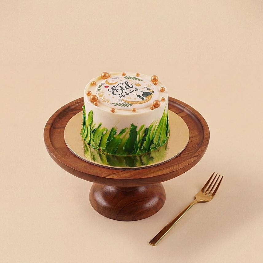 A charming vanilla mini cake featuring an elegant “Eid Mubarak” design with luxurious golden accents. Perfect for quick gifting, Eid visits, or as a delightful addition to your festive table.