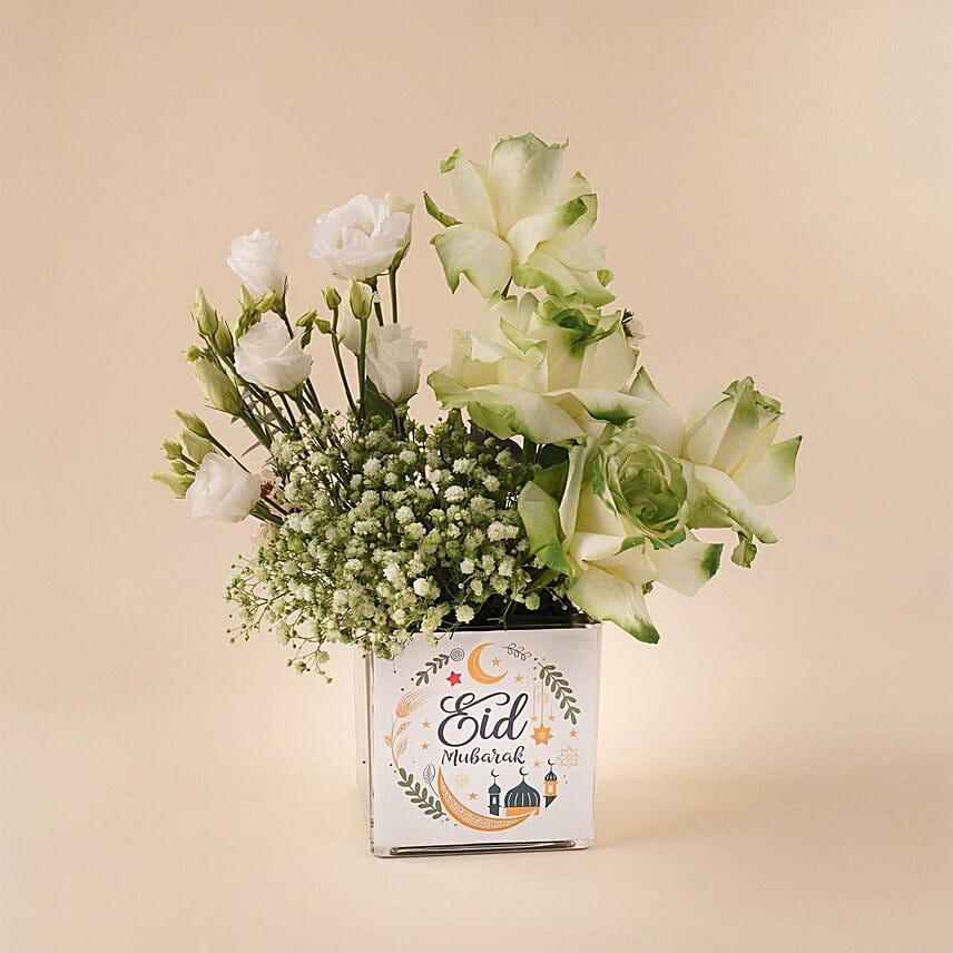 Presented in a modern square glass vase adorned with an “Eid Mubarak” sticker, this arrangement adds a refined decorative touch to any home, perfect for sharing heartfelt Eid wishes.