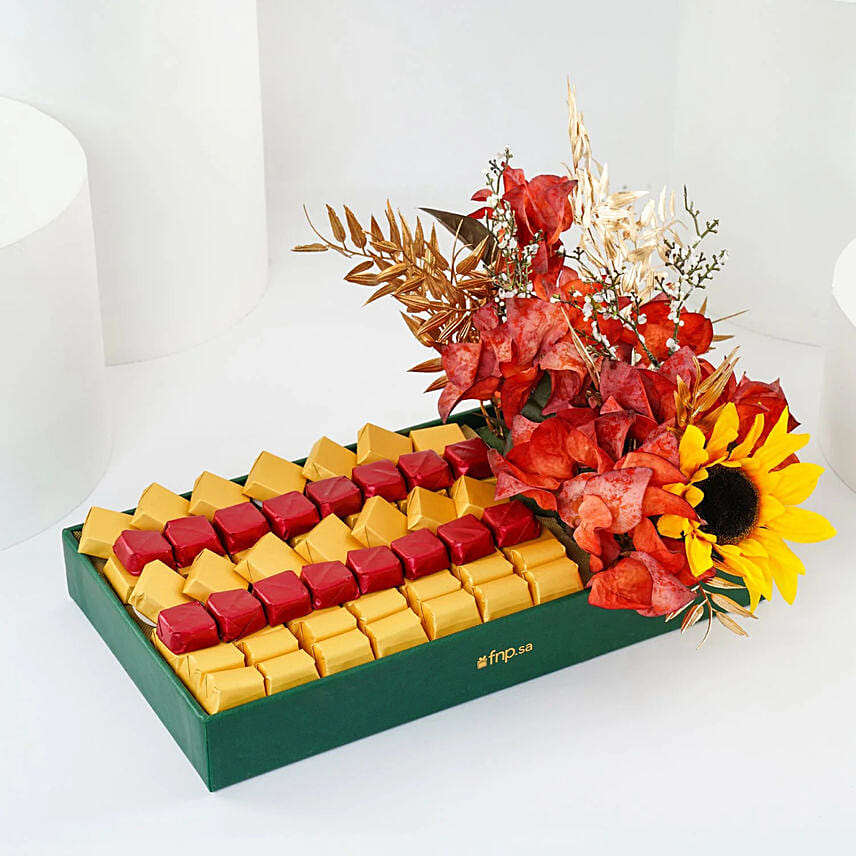 Express your feelings in an elegant way with this luxurious tray of chocolates and roses. Sparkling with 58 luxurious chocolates and artificial flowers in soft colours, elegantly arranged in a luxurious long leather tray. Perfect for romantic occasions, anniversaries, Valentine's Day, birthday or to express appreciation to someone special.