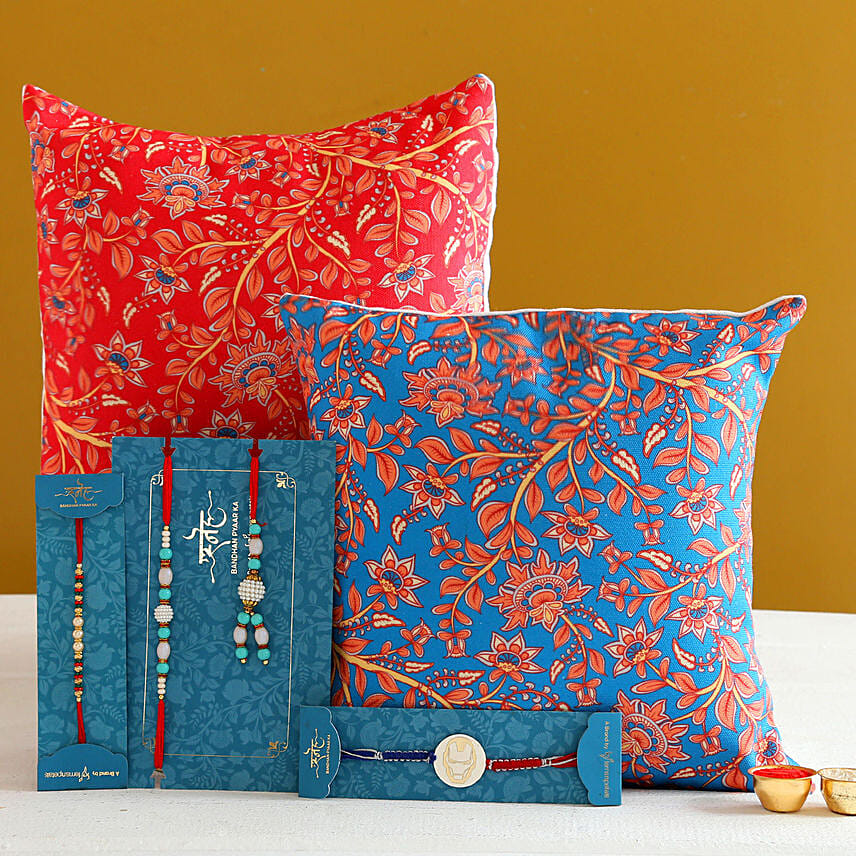 Family Rakhi Set With 2 Floral Print Cushions