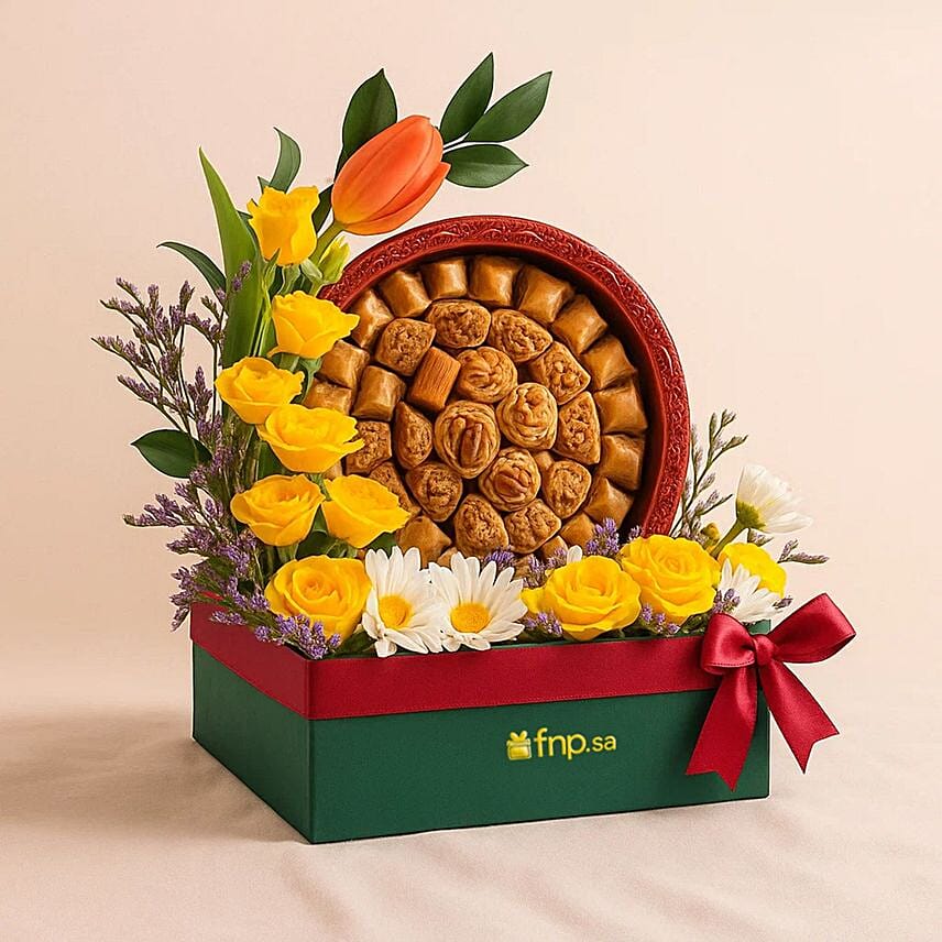 Bring joy to the hearts of your loved ones with a luxurious gift that combines the beauty of roses and the distinctive taste of delicious Arabic sweets. This flower and sweets gift combo includes enchanting baby roses and lilies, presented in a luxurious flower box with half a kilogram of Diplomatic Baklava, known for its rich flavor and perfect texture. This combo is perfect for birthday, anniversary, housewarming, thank-you gifts, or just to bring joy.
