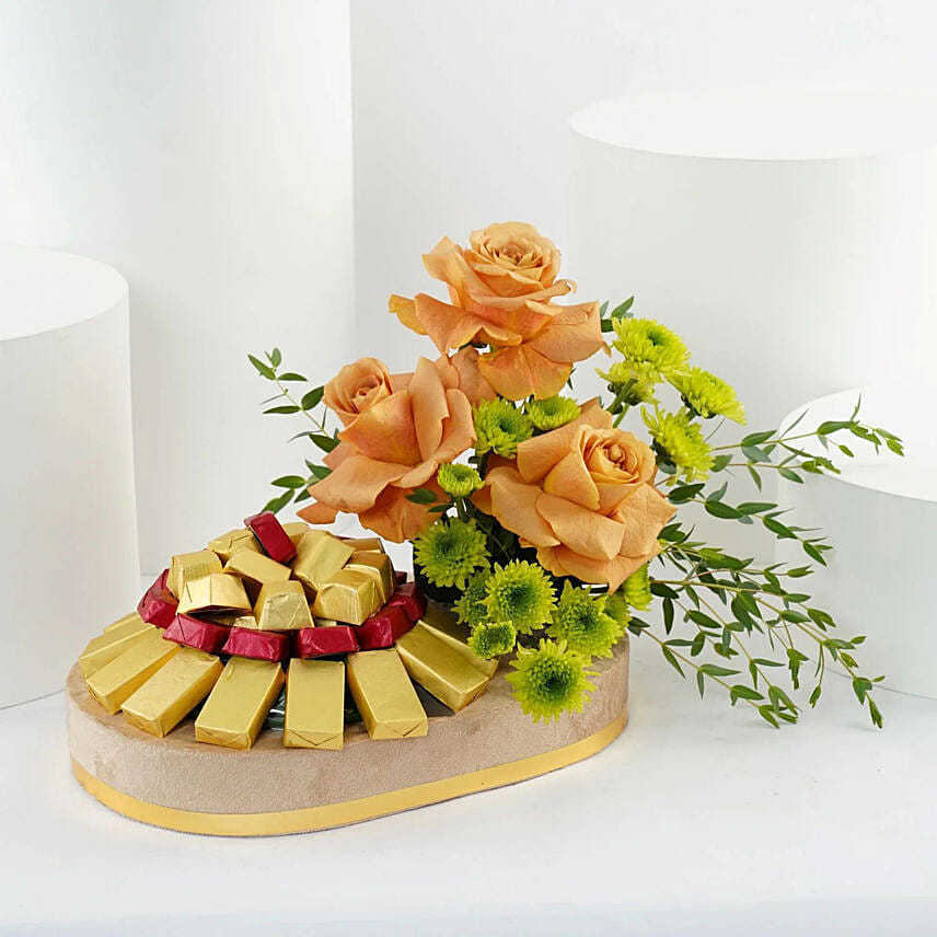 Add a touch of elegance and sophistication to any occasion with Antique Beauty of Roses and Chocolate, a luxurious combination of beauty and wonderful taste. This arrangement includes cappuccino roses with stunning green chrysanthemums, as well as delicious chocolate pieces, presented in an elegant velvet tray for an unforgettable gift.