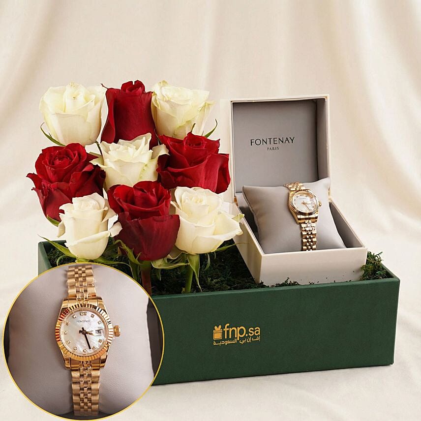 An elegant gift that blends the timeless beauty of roses with the precision of fine watchmaking, designed to reflect refined taste and thoughtful detail. This arrangement is presented in a luxurious FNP green long tray, adorned with a harmonious mix of red and white roses symbolizing love, elegance, and purity. The gift is elevated with a Fontenay Paris gold watch, featuring a high-quality stainless steel bracelet, and powered by a reliable Japanese Miyota quartz movement for exceptional accuracy and long-lasting performance.