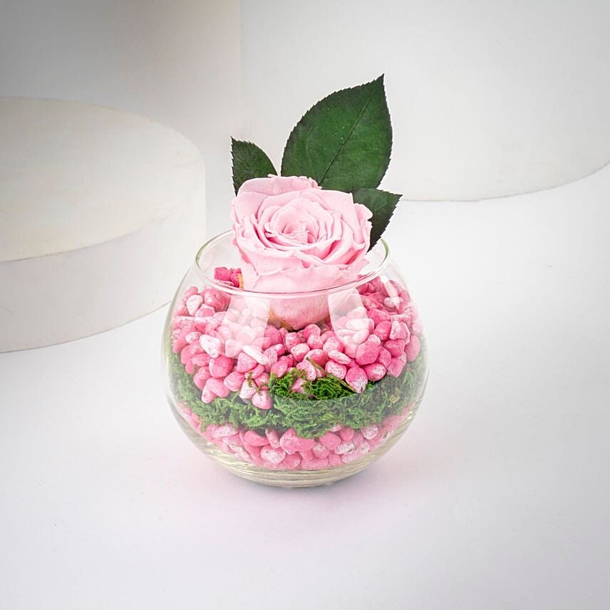 A timeless symbol of love that lasts forever! This elegant design features an everlasting rose vase featuring a preserved pink rose carefully arranged inside a small glass vase with preserved leaves, dried moss, and decorative stones. A beautiful, timeless gift that expresses love in the most beautiful ways.