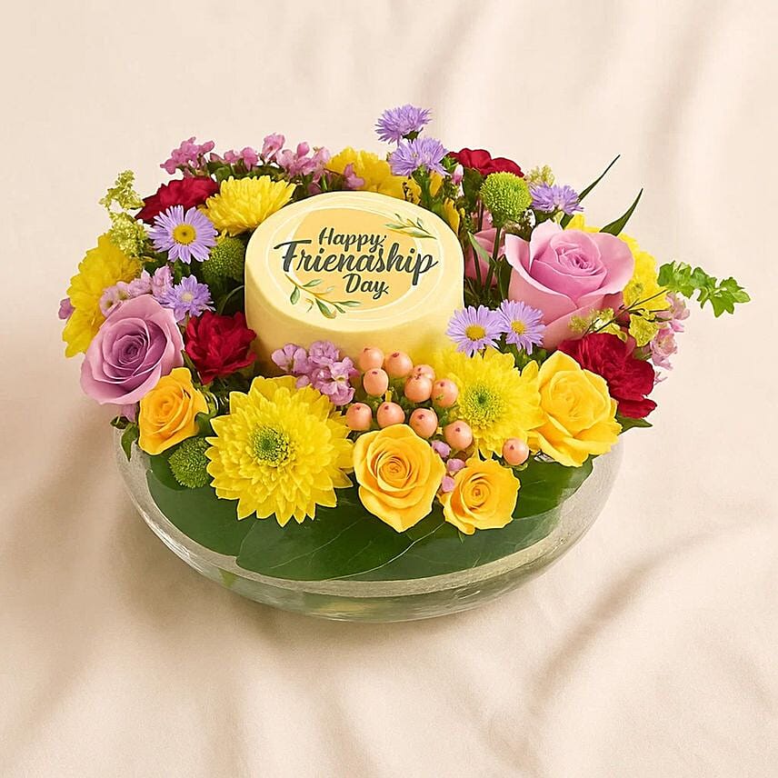 A vibrant flower pot containing a small cake for friendship day celebrations surrounded by a bouquet of colorful roses. A perfect gift to bLeften up your best friend s day.