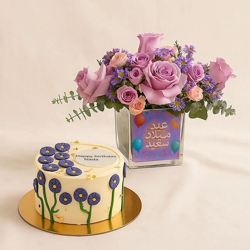 Featuring purple roses, stunning aster branches, a special birthday flower vase, and a personalized birthday cake.