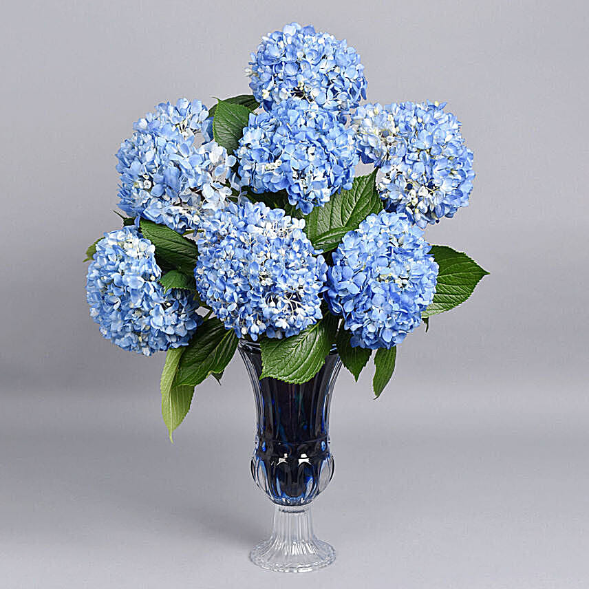 Product Details: 8 Dark Blue Hydrangea Arranged Beautifully In a Transparent Pedestal Glass Vase.