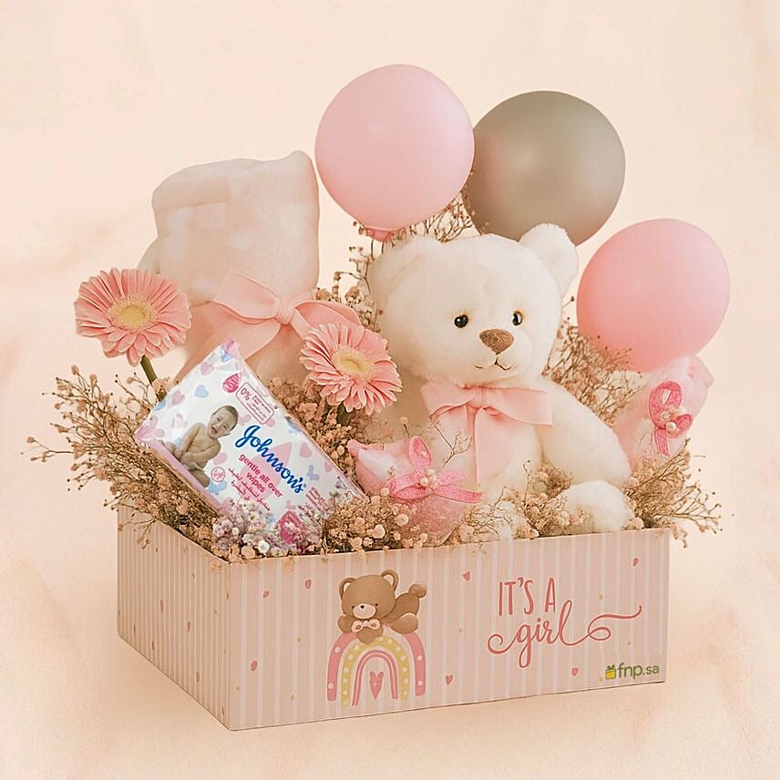 Pink box of flowers and gifts to celebrate the new baby girl. It contains