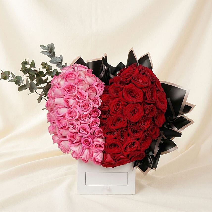 A striking heart-shaped rose arrangement that beautifully blends passion and tenderness. One half of the heart is crafted with rich red roses symbolizing deep love, while the other half features soft pink roses expressing care and affection, creating a perfectly balanced romantic statement.