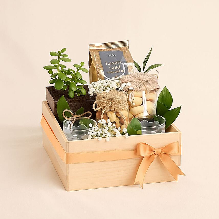 Pamper your loved ones with an elegant gift that combines tranquility and good taste. A luxurious box containing premium M&S English Breakfast Tea, delicious sweets and cookies wrapped in natural fabric touches, two distinctive tea cups, and a natural plant that adds a refreshing green touch. The gifts are carefully arranged inside a wooden box decorated with an elegant ribbon, making it a sophisticated gift for any occasion. Perfect for housewarming, a gift for dad, a gift for mum or as a congratulations and appreciation gift for a loved one.