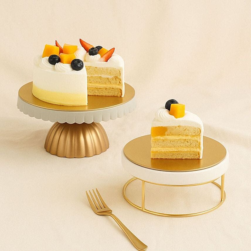 Enjoy a delicious tropical taste with this mango fruit cake, baked with three fluffy layers soaked in rich mango flavor. Topped with fresh fruit pieces for a refreshing taste. Perfect for special occasions or just to enjoy a special time.