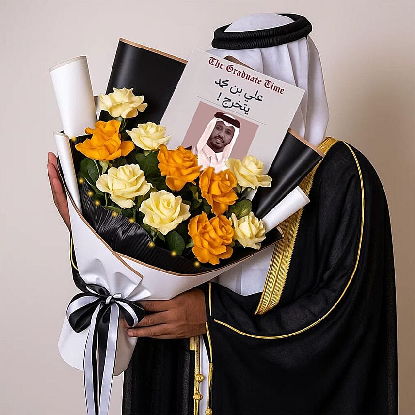 Product DetailsCelebrate graduation in a manner befitting the occasion with a stunning men s bouquet featuring the graduate s name and photo in a cute scoop. This graduation bouquet features a mix of vibrant roses, elegantly wrapped and presented in a distinctive style. Custom printing adds a special touch, making it the perfect gift to honor his achievements on this special day.