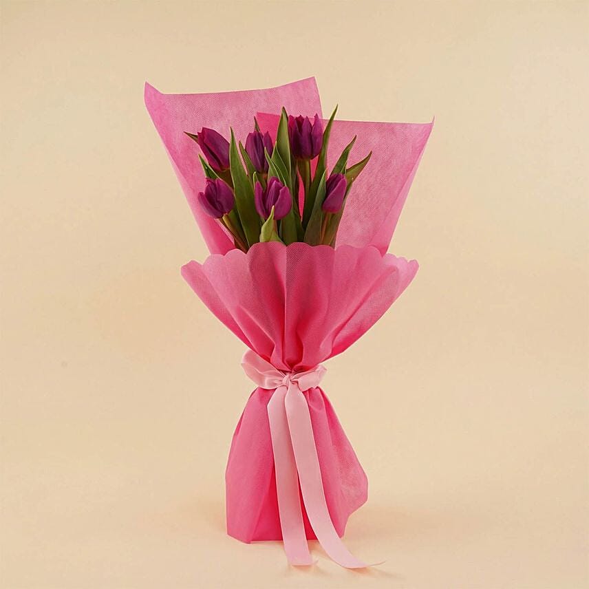 Celebrate the most wonderful woman in your life with our "Mini Purple Tulip Bouquet." These vibrant purple tulips are carefully selected to represent royalty and admiration, making them a perfect tribute to your mother's unconditional love. Wrapped in elegant pink fabric, this bouquet is a charming gesture for Mother’s Day, birthdays, or just to brighten her day with a touch of floral elegance.