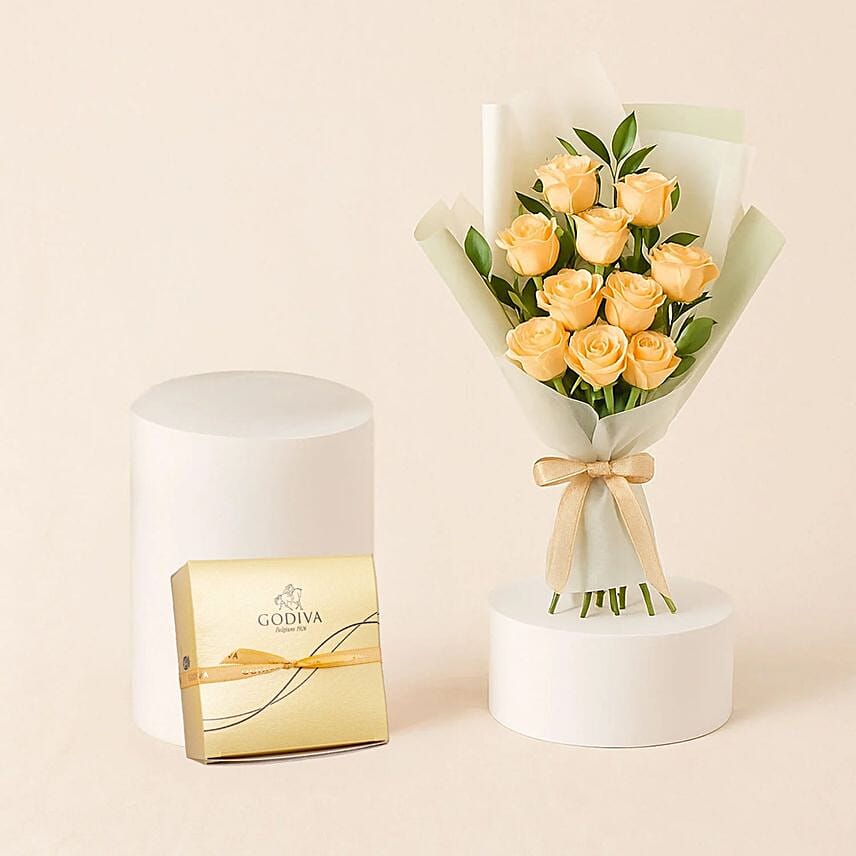 Spoil your loved ones with a charming peach rose bouquet combo with premium Godiva chocolates. This is a perfect gift combo that gives you a variety of options and unique gift ideas. It can be paired with a Godiva gold box or Godiva Naps. Perfect for birthday gifts, anniversary gifts, graduation gifts, holiday gifts, or just to show your love and care. Contains: