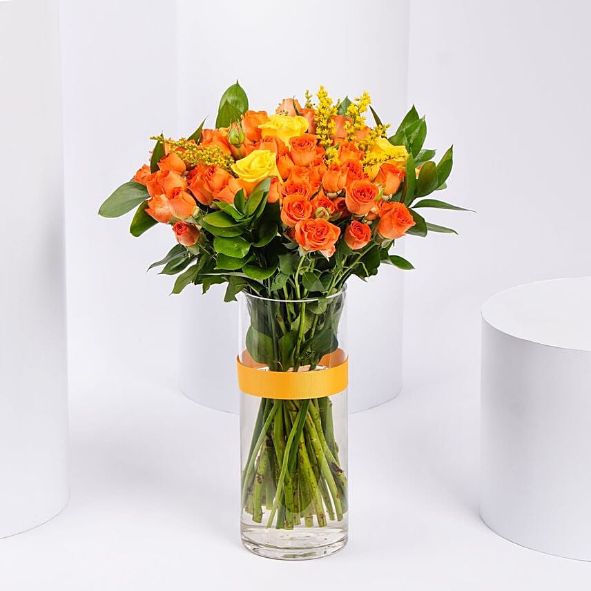 15 Orange Baby Roses5 Yellow Roses 5 RuscusGlass Vase