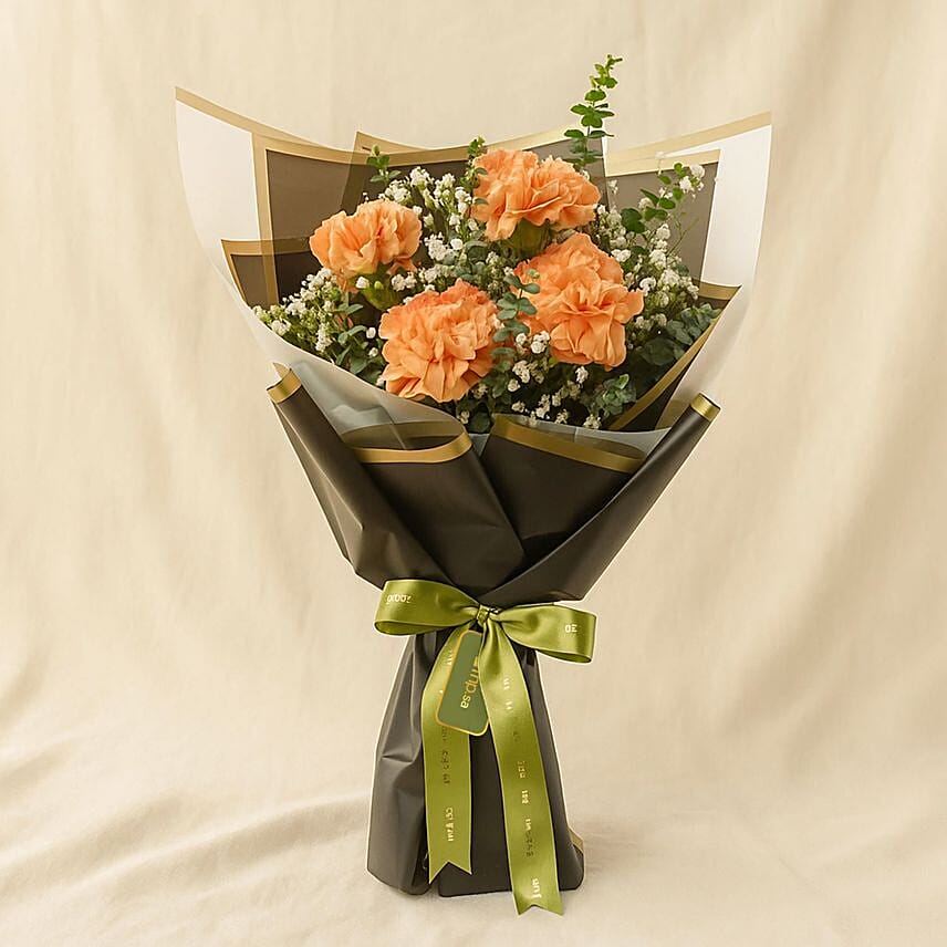 Add bLeftness to any moment with this small bouquet of attractive orange carnations. A charming and suitable gift for love, visiting a patient, or any special moment with your loved ones.
