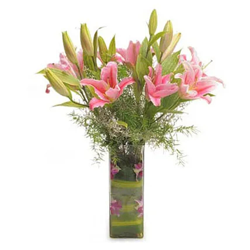 Lilies have that classic ability to say everything that?s in your heart. Our gorgeous gathering of pink lilies will bloom into a bold bouquet that expresses your feelings perfectly, for any reason at all. Bunch of 6 Fresh pink oriental lilies in a long square shape glass vase with some green leaves and green fillers.