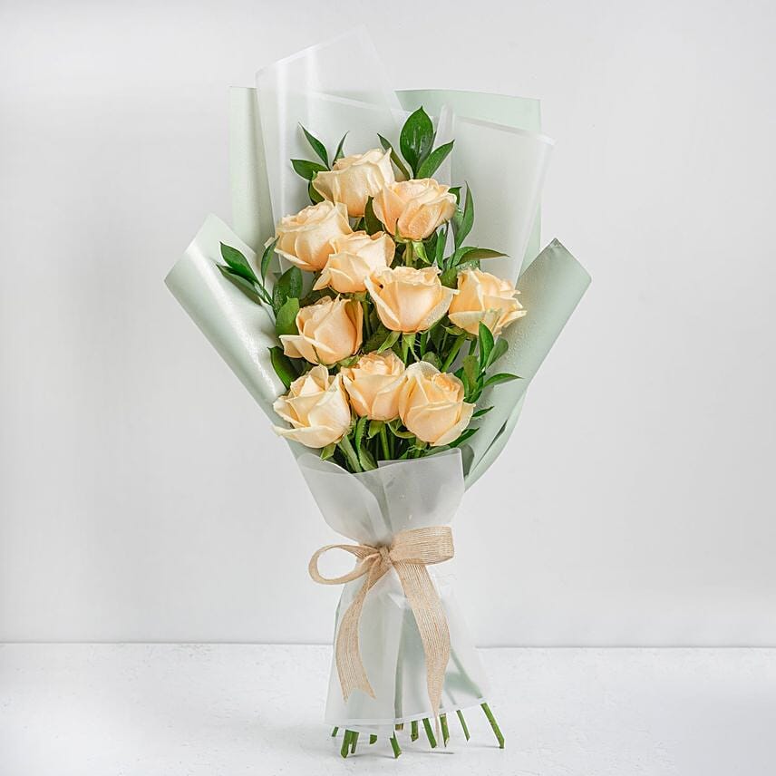 Flower Bouquet of Peach Roses in Light Green Wrapping