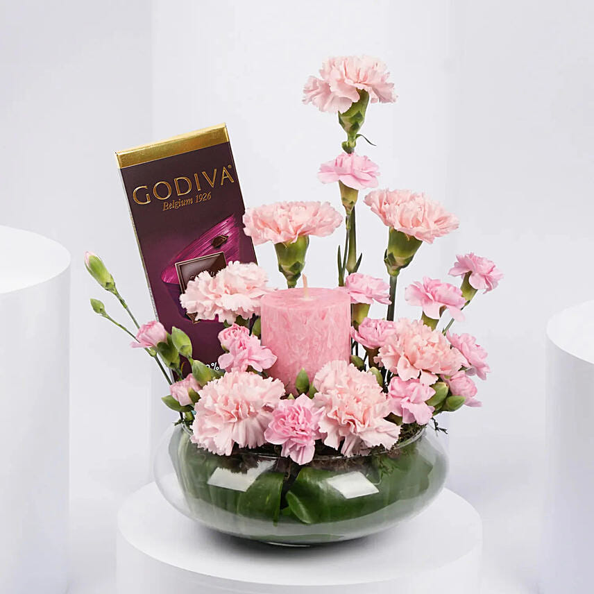 Celebrate in style and create the most beautiful memories with gifts of roses and chocolates. A gift that combines the beauty of carnations with the rich taste of Godiva chocolate with the charming touch of a pink scented candle. Ideal as a gift on Women's Day, Mother's Day, or as part of special women's gifts on all occasions.