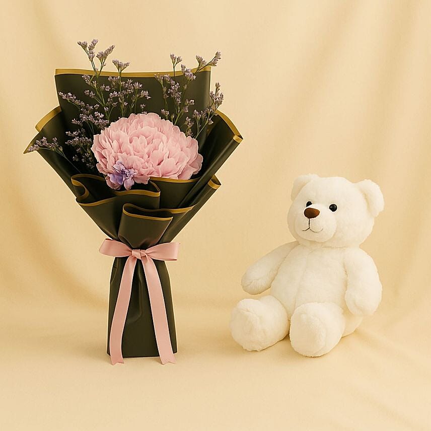 Delight your loved one with an elegant teddy bear and hydrangea bouquet gift combo. This charming set combines a soft white teddy bear and a beautiful bouquet of pink hydrangeas, wrapped in elegant gray paper and finished with a delicate pink ribbon. It s the perfect choice to add warmth, joy, and express love at any time.