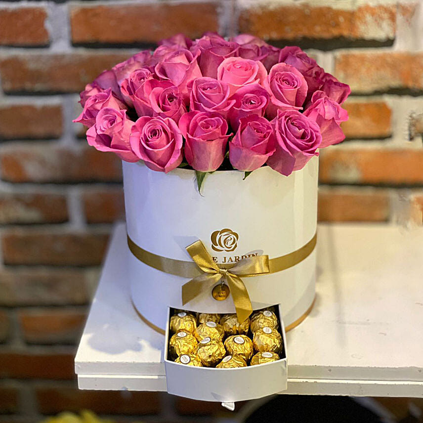 Pink Roses Round Box Chocolates Arrangement