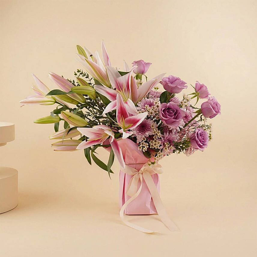 This breathtaking arrangement is a symphony of calming colors and sweet fragrances, where the charm of purple roses meets the luxury of pink lilies to create a serene and joyful display. Carefully designed to be an exceptional gift, this bouquet reflects your refined taste in honoring the most precious person in your life.