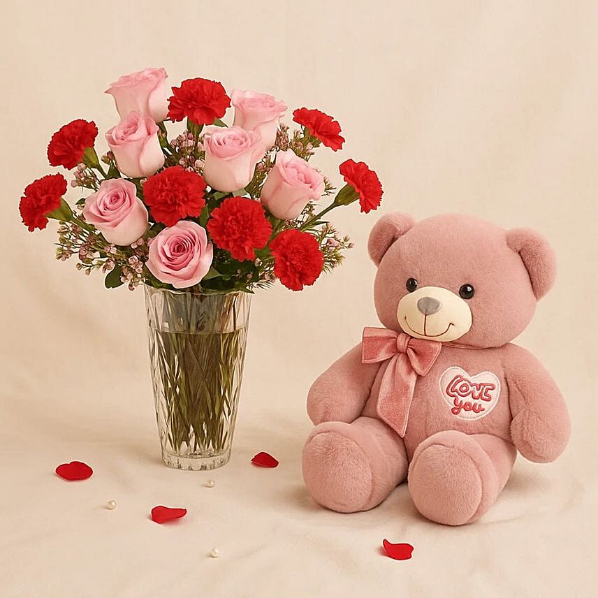 Celebrate love on special occasions with this elegant red and pink rose vase combo with a cute love teddy bear, a luxurious arrangement that combines sophistication and indulgence. Perfect for Valentine s Day, anniversaries, or to express love anytime.
