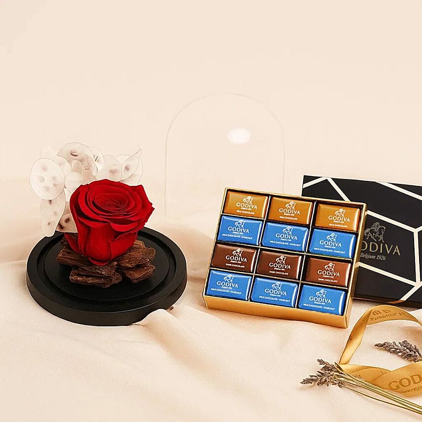 A luxurious gifting experience with Godiva s premium chocolates and an elegant natural everlasting flower arrangement. Give an eternal rose in a sophisticated glass dome, a perfect gift that expresses taste and love and will last in memory.