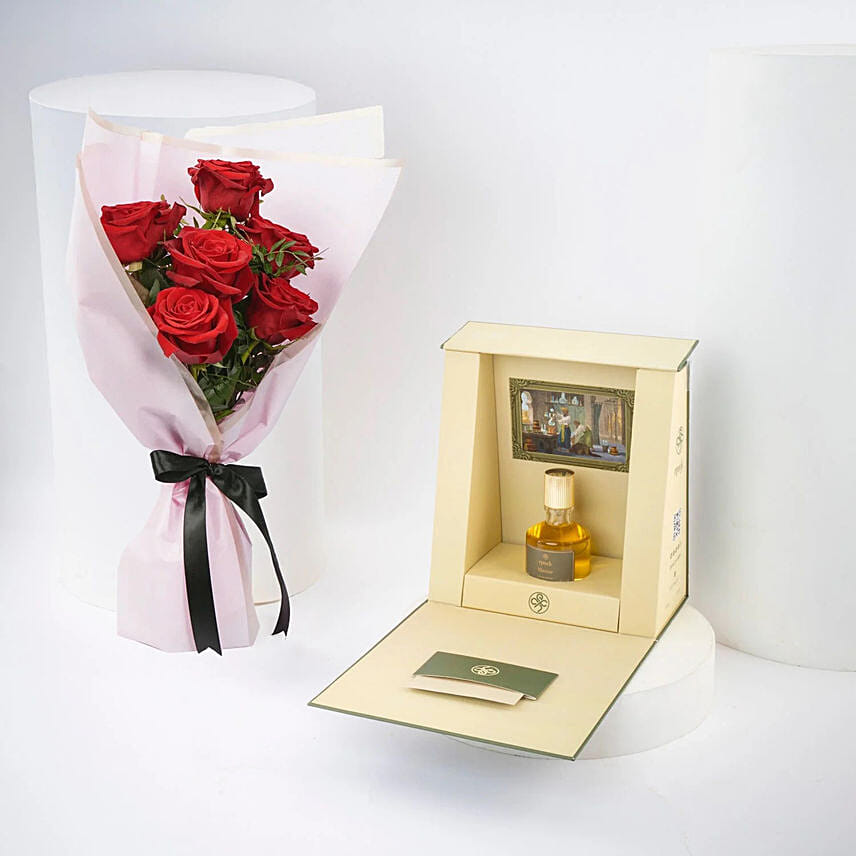 A love gift that combines tenderness and luxury on Valentine's Day! Includes The combo is a charming bouquet of red roses, elegantly wrapped with green leaves. Comes with a package of distinctive Epoch perfumes, to be the perfect gift that adds a touch of romance and sophistication to your celebration this year.