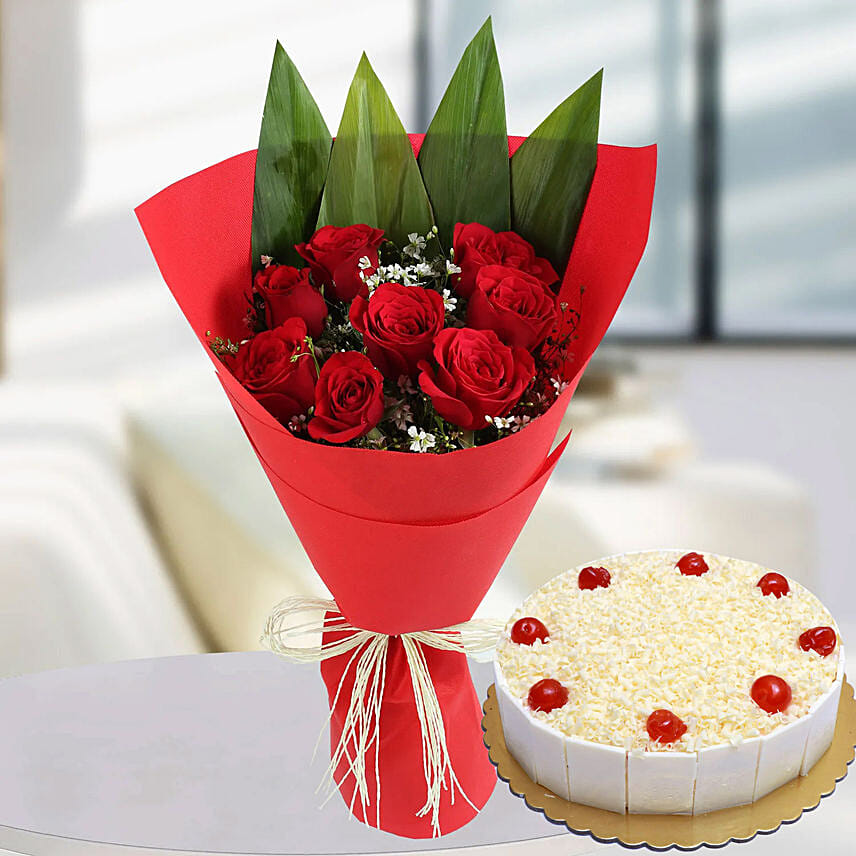Red Roses Bunch & White Forest Cake 8 Portions