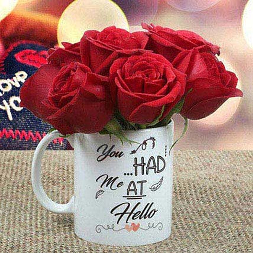 Timeless and graceful, this beautiful floral arrangement in a ceramic coffee mug is sure to please anyone and everyone. Buy these beautiful red roses arranged in a white printed coffee mug from Ferns N Petals and make your loved ones smile.