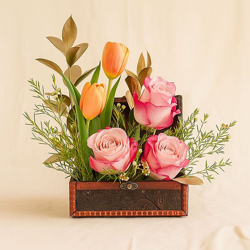 Celebrate the most beautiful moments with an elegant rose and tulip box. This box combines natural beauty and elegance in an arrangement of roses and tulips. This stunning arrangement comes in a wooden box resembling a treasure chest, making it a sophisticated gift for a birthday, anniversary, or housewarming. Or get well soon wishes.