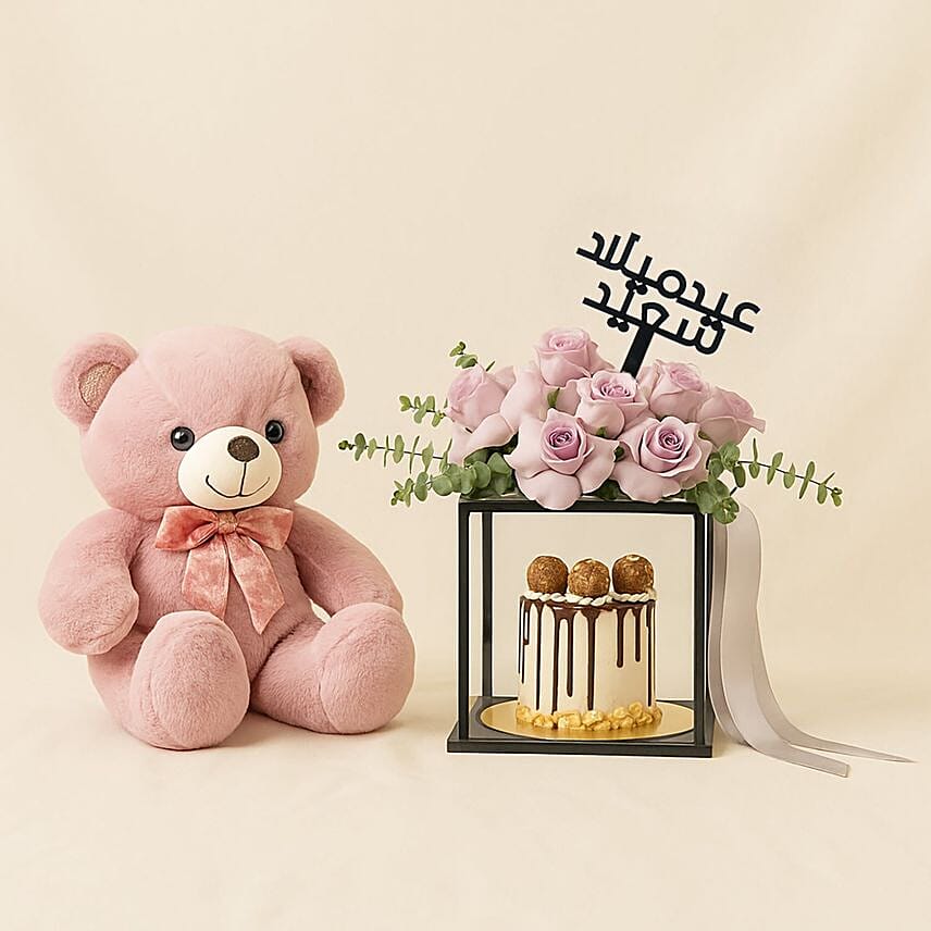 A special gift consisting of a flower stand with a Ferrero Rocher cake and a large teddy bear in a charming and elegant arrangement to make a special birthday gift.