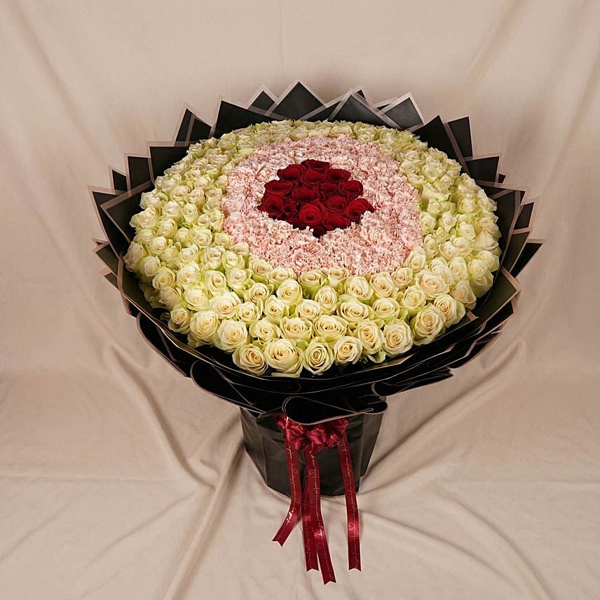 An extraordinary heart-shaped floral masterpiece crafted to express deep love and grand emotions. This luxurious arrangement combines the purity of white roses, the softness of pink carnations, and a striking red rose heart centerpiece that speaks straight to the soul.