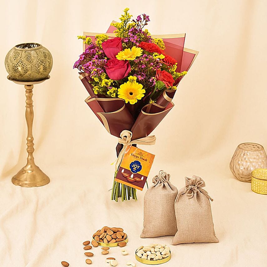 Celebrate Diwali with a gift collection of roses, Indian sweets, and delicious and luxurious chocolates from FNP. This delightful combo is a perfect representation of the joy and happiness of Diwali, the festival of lights. Pamper yourself and your loved ones with a luxurious assortment of delicious nuts along with a bouquet of roses in cheerful and distinctive colors.
