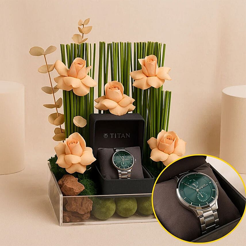 Surprise her with a gift that combines modern elegance with tranquil nature. The Titan Neo 10 women s watch, with its modern design and attractive green dial, is presented within a luxurious botanical arrangement of cappuccino roses and gold-plated eucalyptus branches. A perfect choice for birthdays, anniversaries, or any occasion that deserves a unique touch.