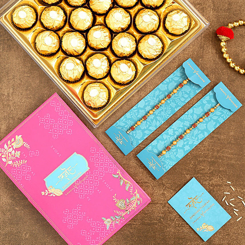 Traditional Pearl Studded Rakhi Set And 16 Pcs Ferrero Rocher
