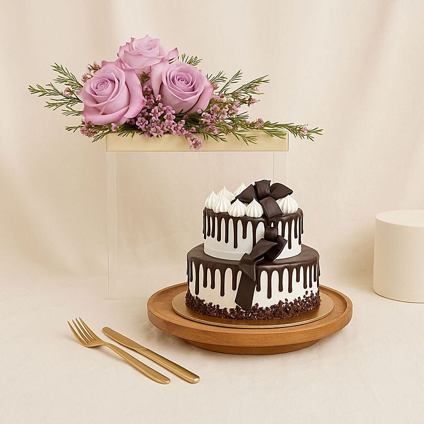 Pamper your loved one s senses with this perfect combination of elegance and sweetness in a purple rose bouquet with a chocolate layered cake. This luxurious combo combines the magic of roses The cake tastes delicious, making it an ideal choice for celebrations or special surprises on birthdays and anniversaries.