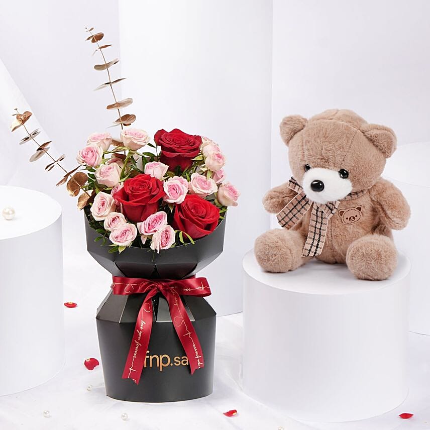 p styledirection ltrMake Valentines Day this year even more special with a romantic combo that expresses your deepest feelings! A gorgeous bouquet of red roses and pink Spray Rose with touches of golden eucalyptus, elegantly wrapped in a black envelope, and accompanied by a cute brown teddy bear. The perfect gift to express love, warmth and beautiful feelings.p ul li styledirection ltr text-align left3 Red Rosesbr3 Pink Rose SprigsbrPistachio SprigbrNnbspGold EucalyptusbrBlack BouquetbrRed Gift RibbonbrBrown Teddy BearNnbspli ul