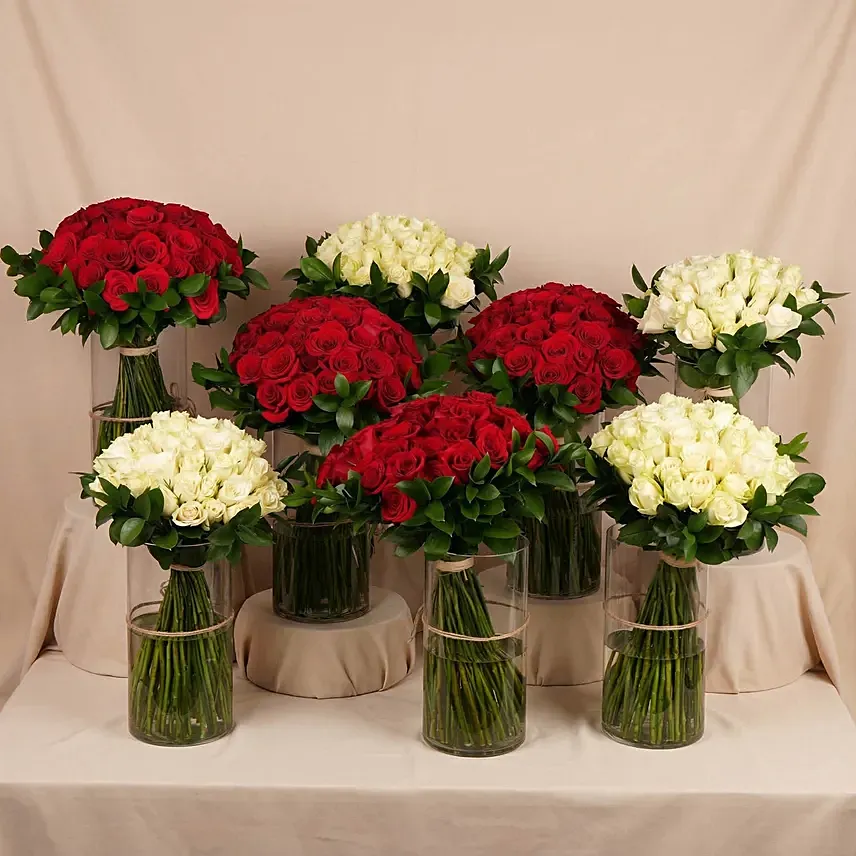 Celebrate love in its most elegant form with this luxurious collection of red and white rose arrangements. Designed to create a striking visual impact, this refined set blends passion and purity in perfect harmony, transforming any space into a romantic statement of beauty and emotion.