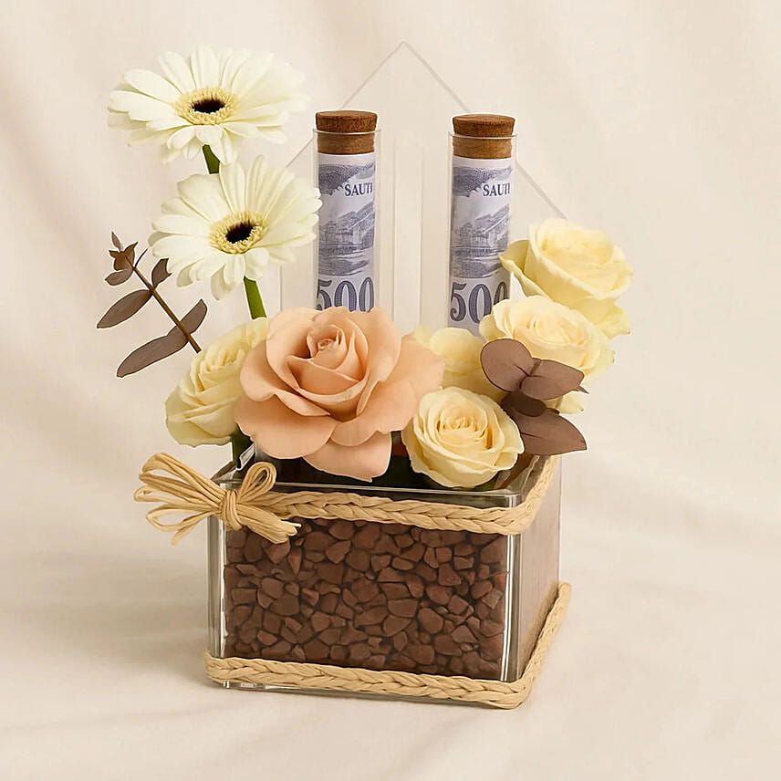 The most beautiful combo gifts of a bouquet of flowers and a sum of money from FNB, including 1,000 riyals divided into two glass tubes