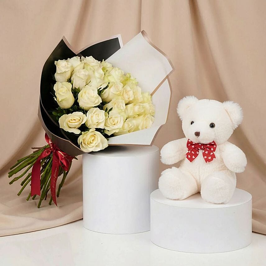 Paired with a cute, lovely teddy bear holding a red heart, this gift offers a delightful balance of beauty and warmth. Perfect for Valentine’s Day, anniversaries, or romantic surprises, it is a graceful way to turn heartfelt feelings into a memorable gesture.