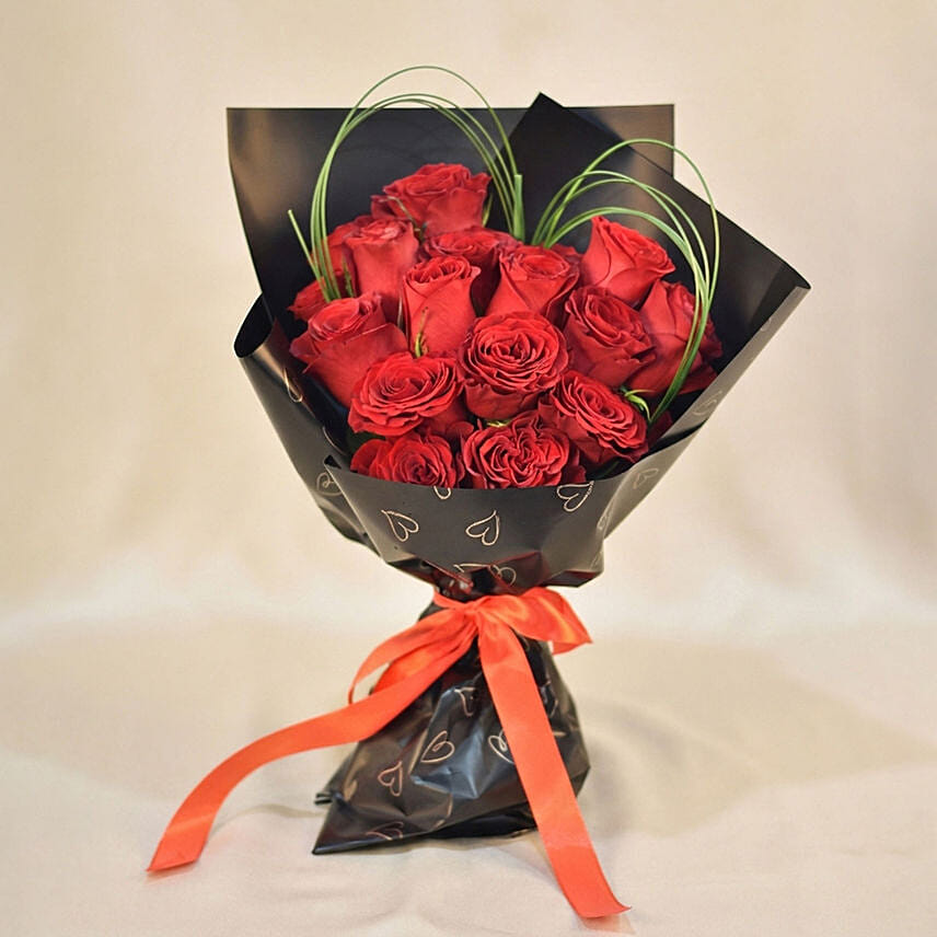 A bold and passionate bouquet of classic red roses accented with elegant steel grass, beautifully wrapped to make a timeless Valentine’s statement straight from the heart.