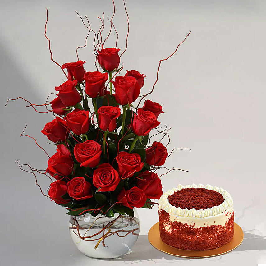 22 Red Roses In A Fish Bowl With Cake For Valentines