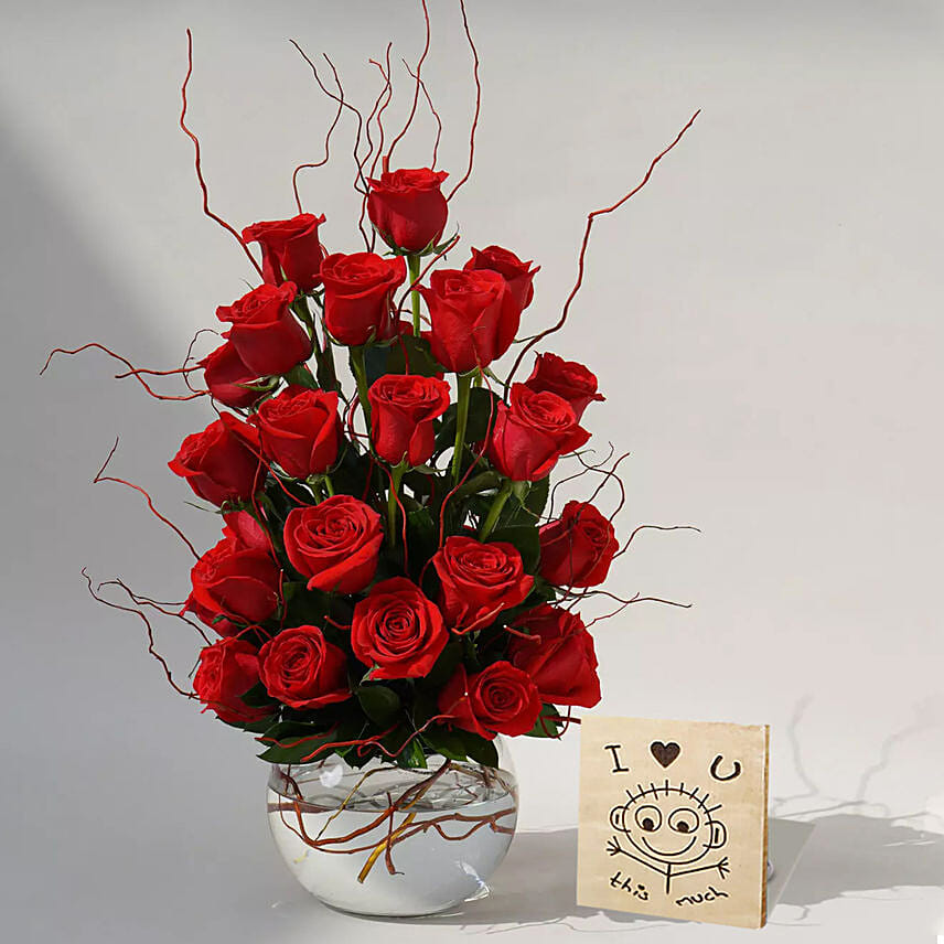 22 Red Roses In A Fish Bowl With I Love You Table Top For Valentines