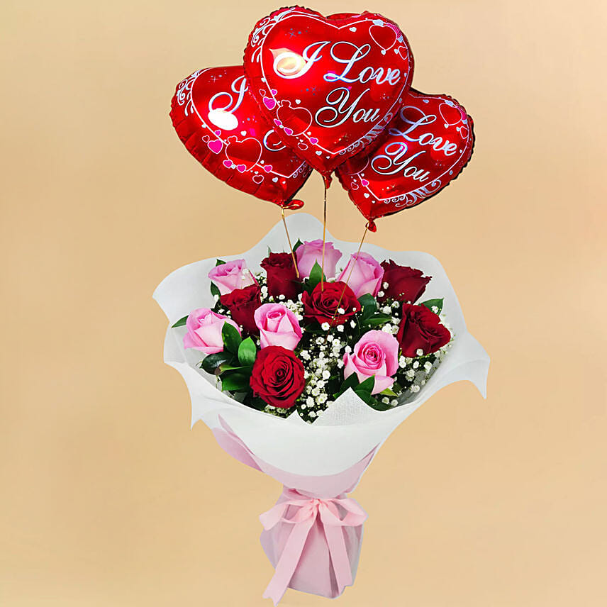 6 Pink & 6 Red Roses Pretty Bouquet with I Love You Balloons