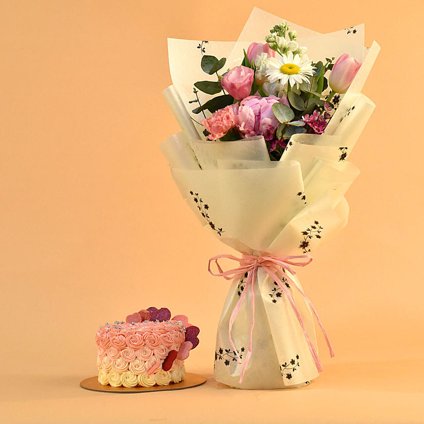 Beautiful Mixed Flowers Bouquet & Floral Heart Choco Cake