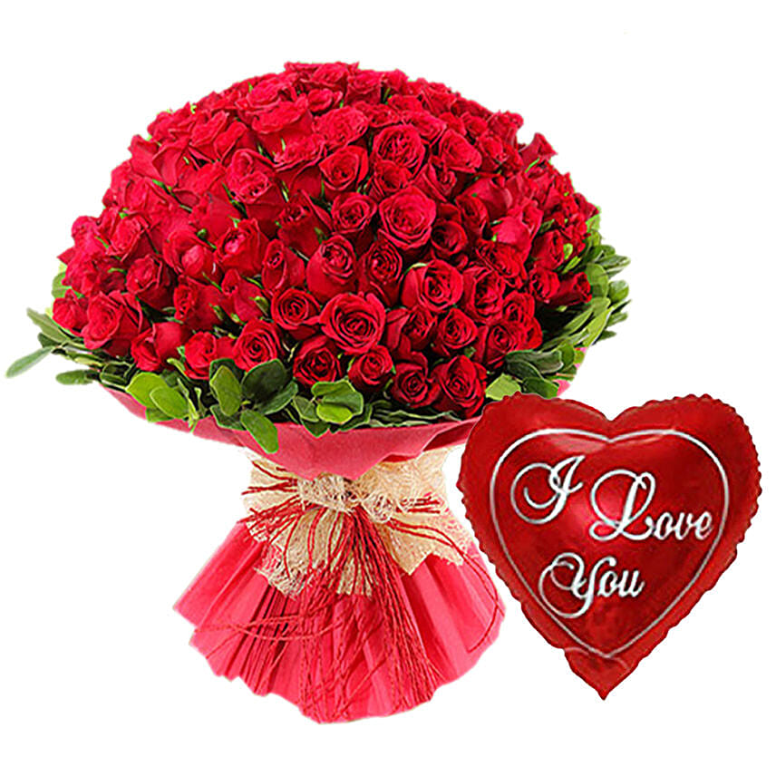 Bouquet Of 100 Roses With I Love You Balloon For Valentines